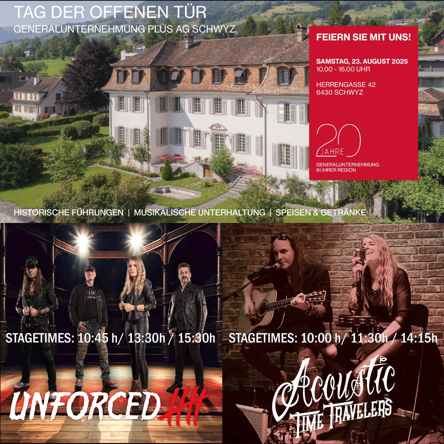 Am Samstag 23.08.2025 rocken wir zusammen mit unseren Freunden von ACOUSTIC TIME TRAVELERS am Tag der Offenen Tür, an der Herrengasse 42, in 6430 Schwyz.